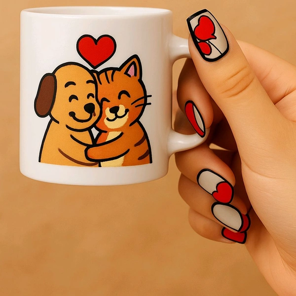 Cute, compact, and heartwarming! This Sublimation Mini Mug is perfect for anyone who wants to sip love and friendship with every drink. Featuring an adorable hugging cat and dog illustration, this mug will brighten your day instantly.